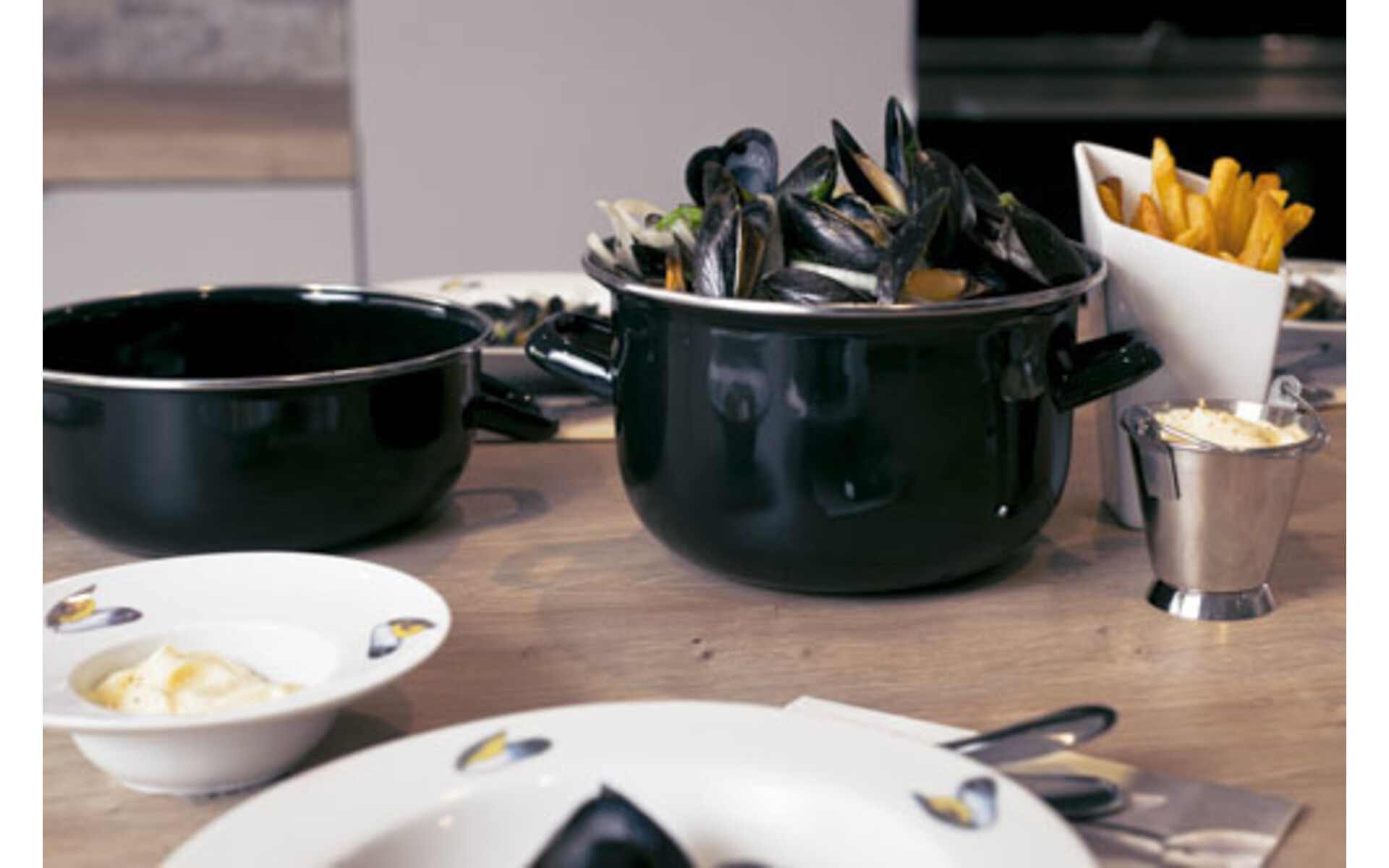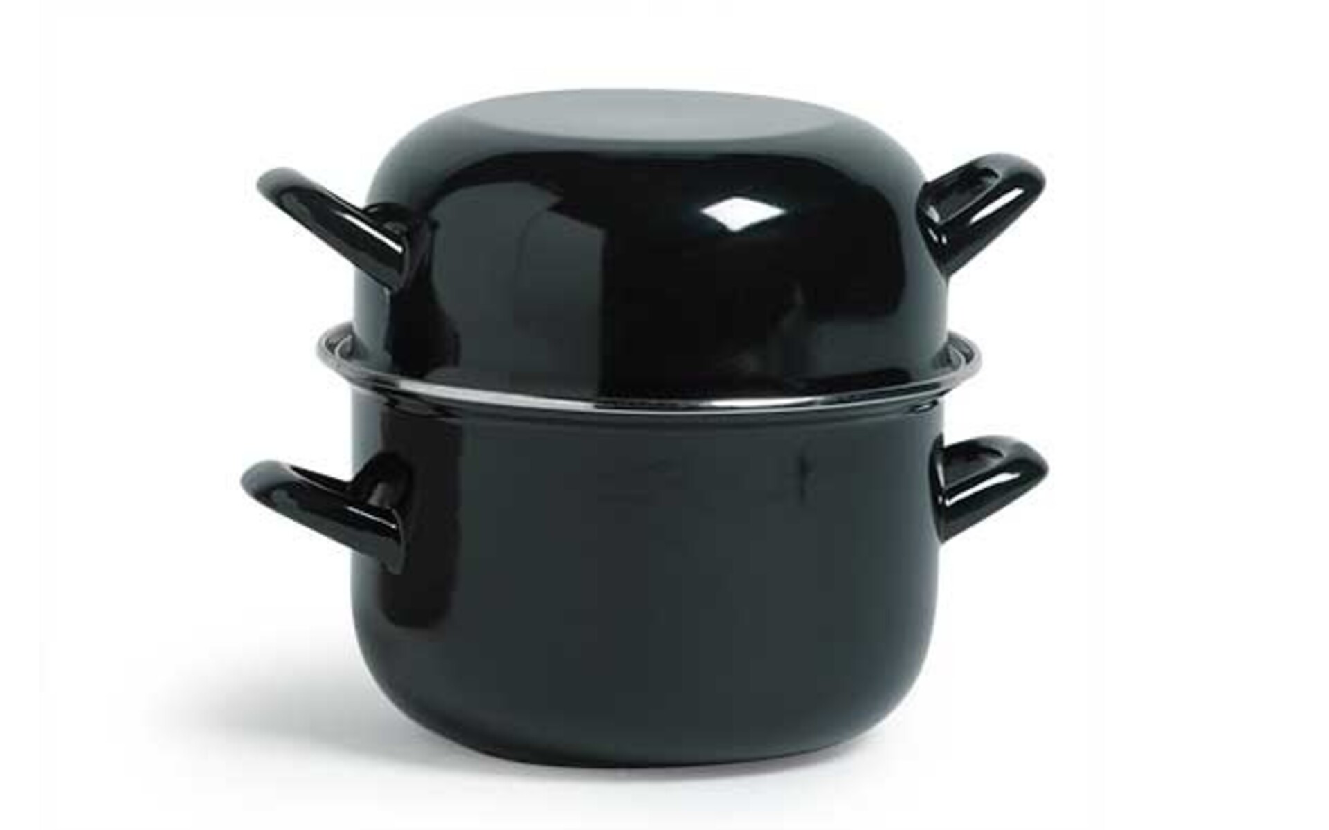 Deze mosselpan is geschikt voor koken op inductie vuur, het deksel kan gebruikt worden om de lege schelpen in te doen. Ideaal voor serveren van keuken in zaal.