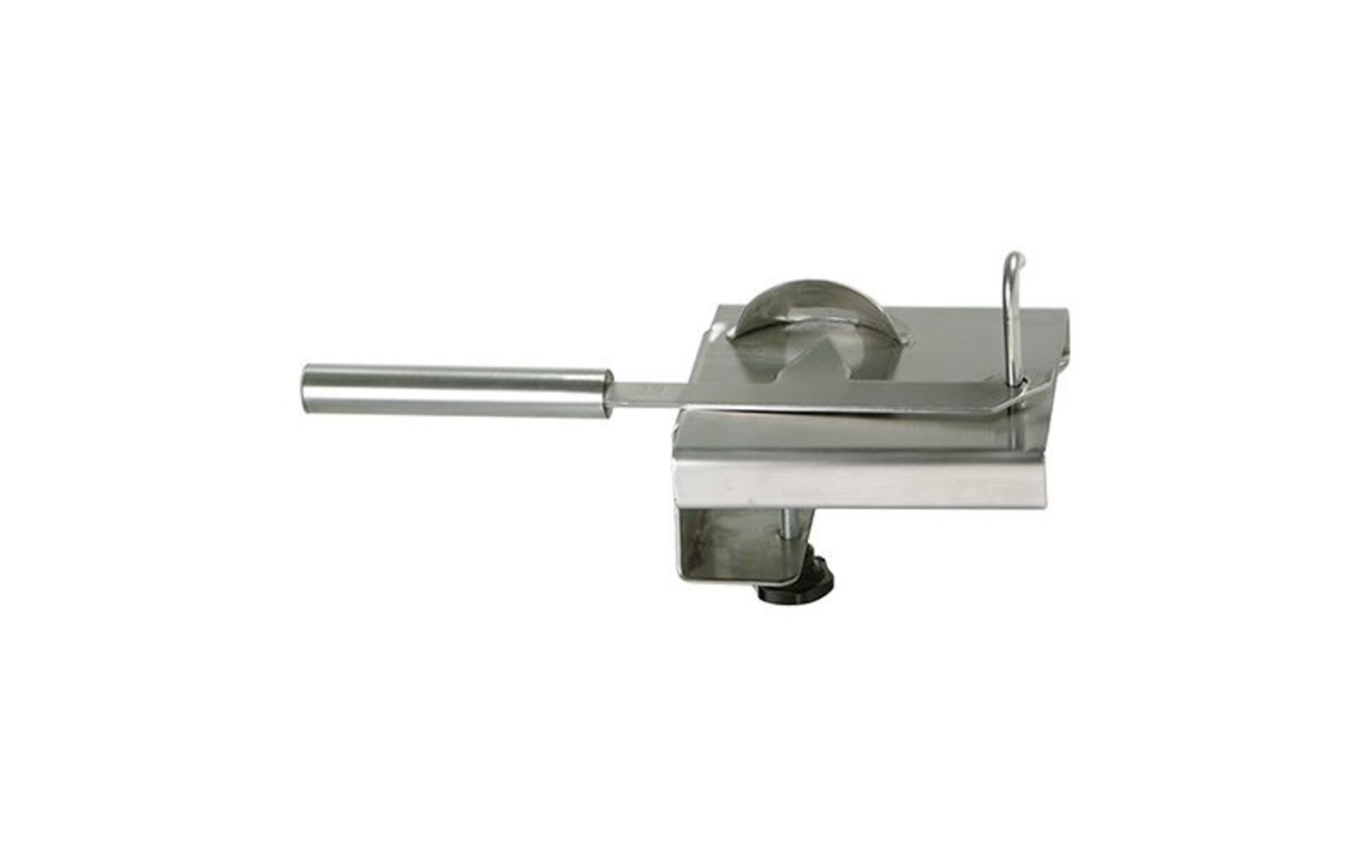 Werkoppervlak in roestvrijstaal. Afm. 15x18 cm. Totale lengte van het afneembaar mes : 37 cm. Tafelmodel vast te schroeven op een werkblad of werktafel. Zeer makkelijk schoon te maken.