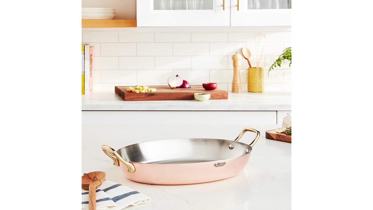 Ronde schotel buitenzijde koper 90 % binnenzijde rvs 10 % Diam. 24 cm - DE BUYER