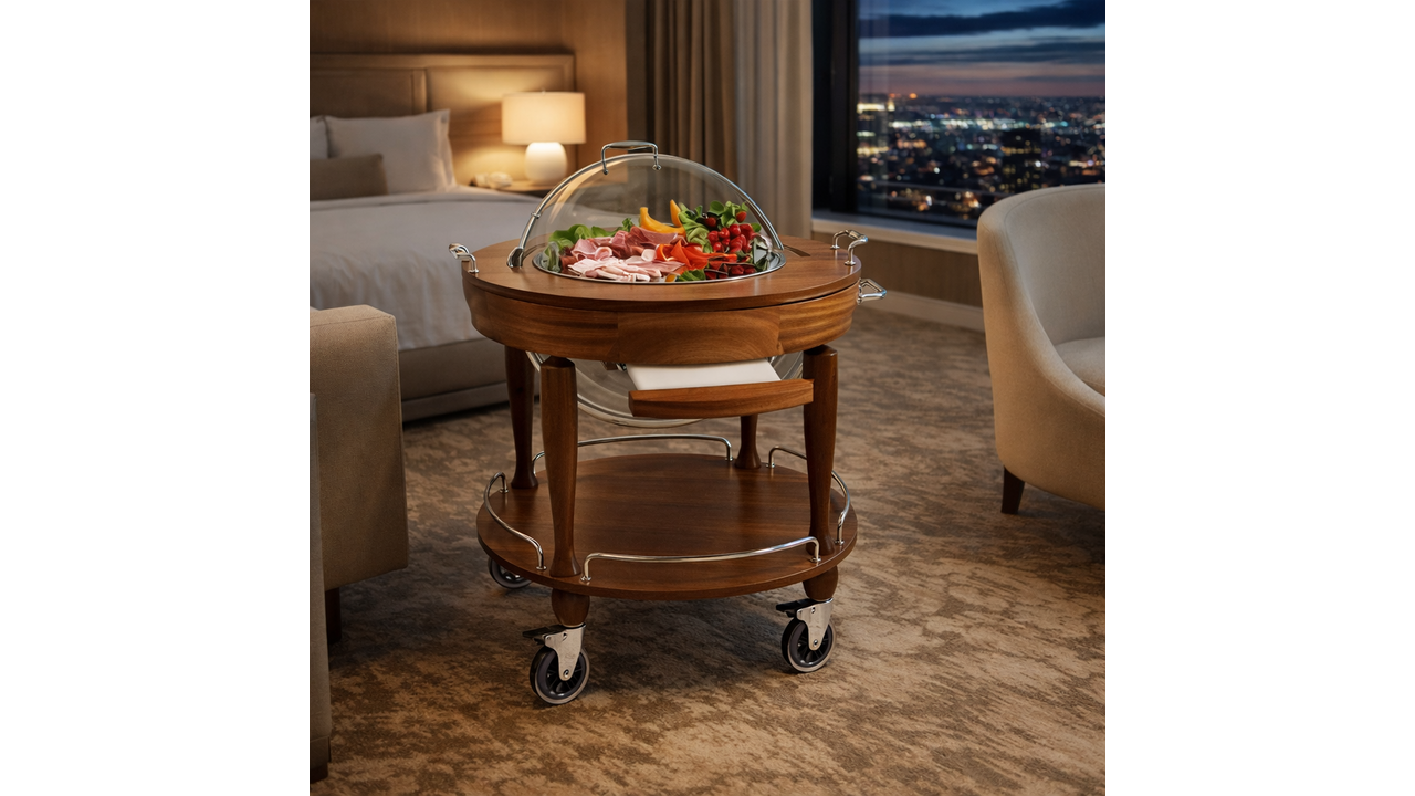 De PARIS Ronde Basis Serveerwagen combineert een elegant design met praktische functionaliteit. Met een ronde structuur van massief hout biedt deze trolley duurzaamheid en een tijdloze uitstraling, ideaal voor horeca- en serviceomgevingen.