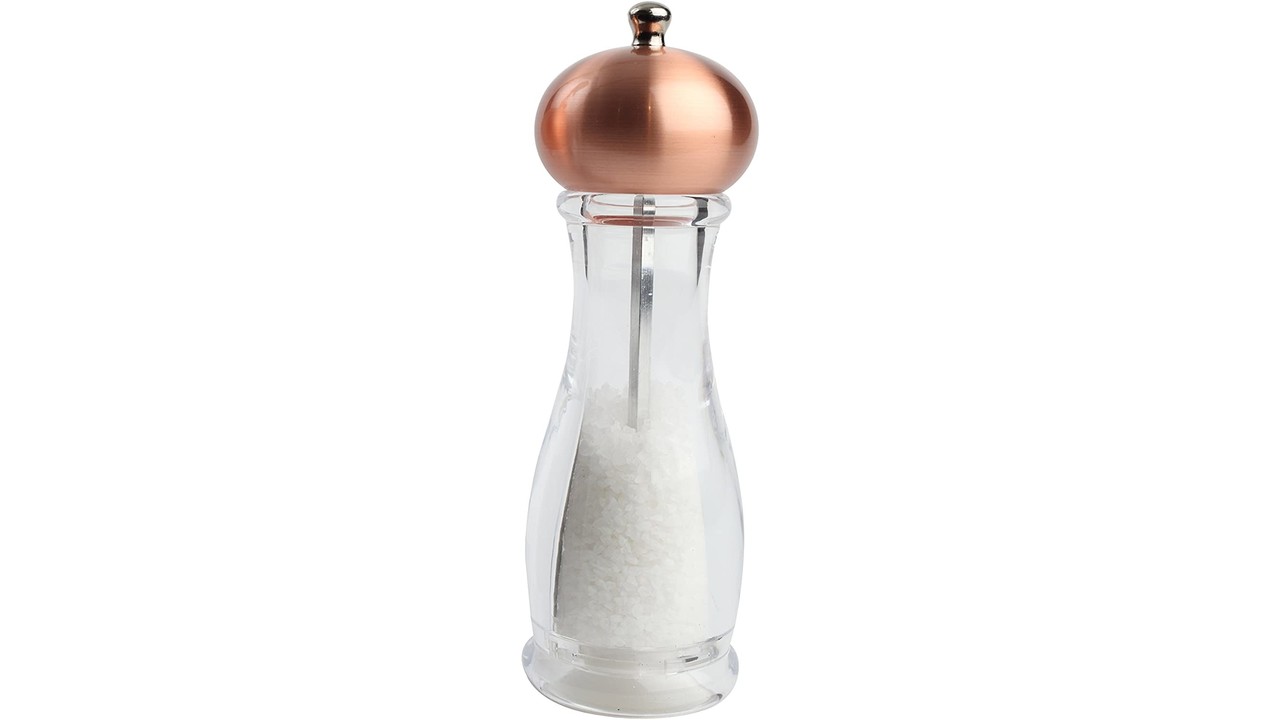 Lichaam van transparant acryl, afwerking in koperlook. Hoogte 15cm.