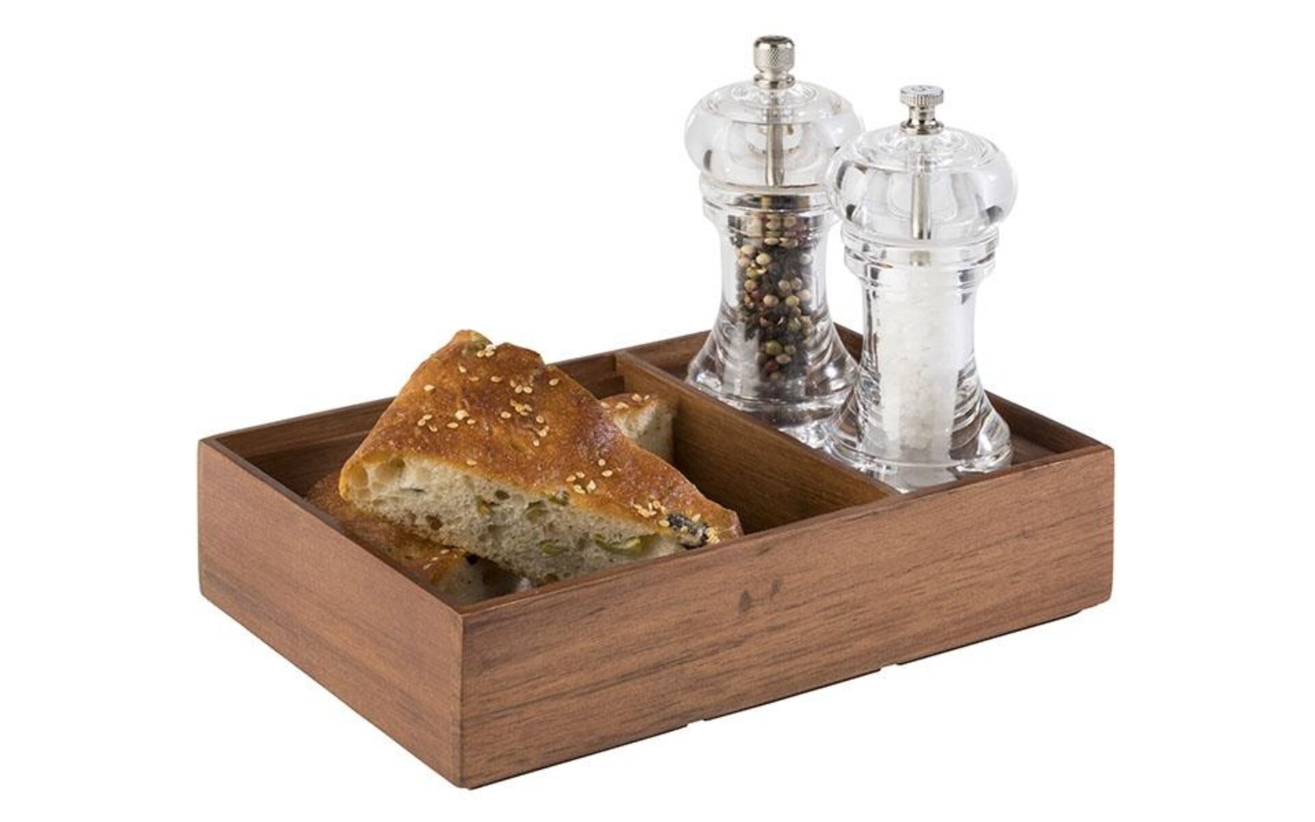 Deze 3 delige set omvat een pepermolen acryl hoogte 15 cm een zoutmolen acryl hoogte 15 cm en een houten box afm. 22,5 x 15 x h 5,5 cm voorzien van 2 compartimenten.