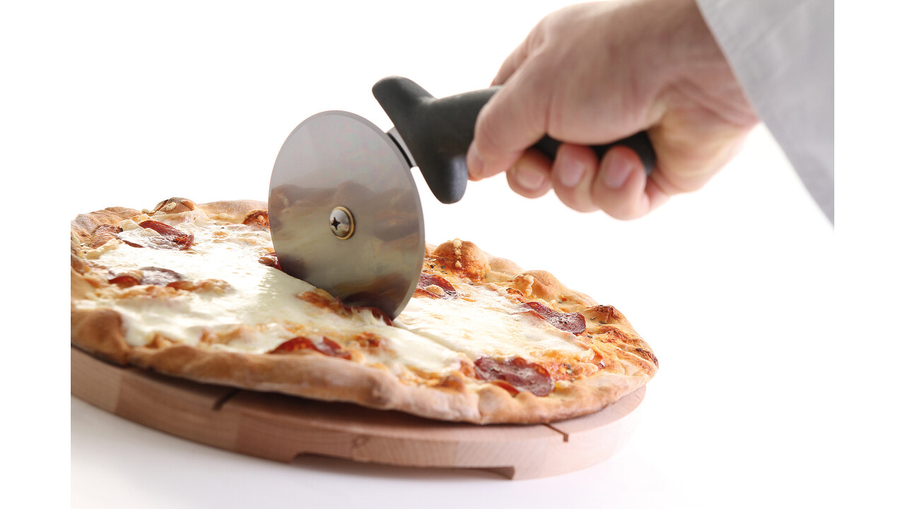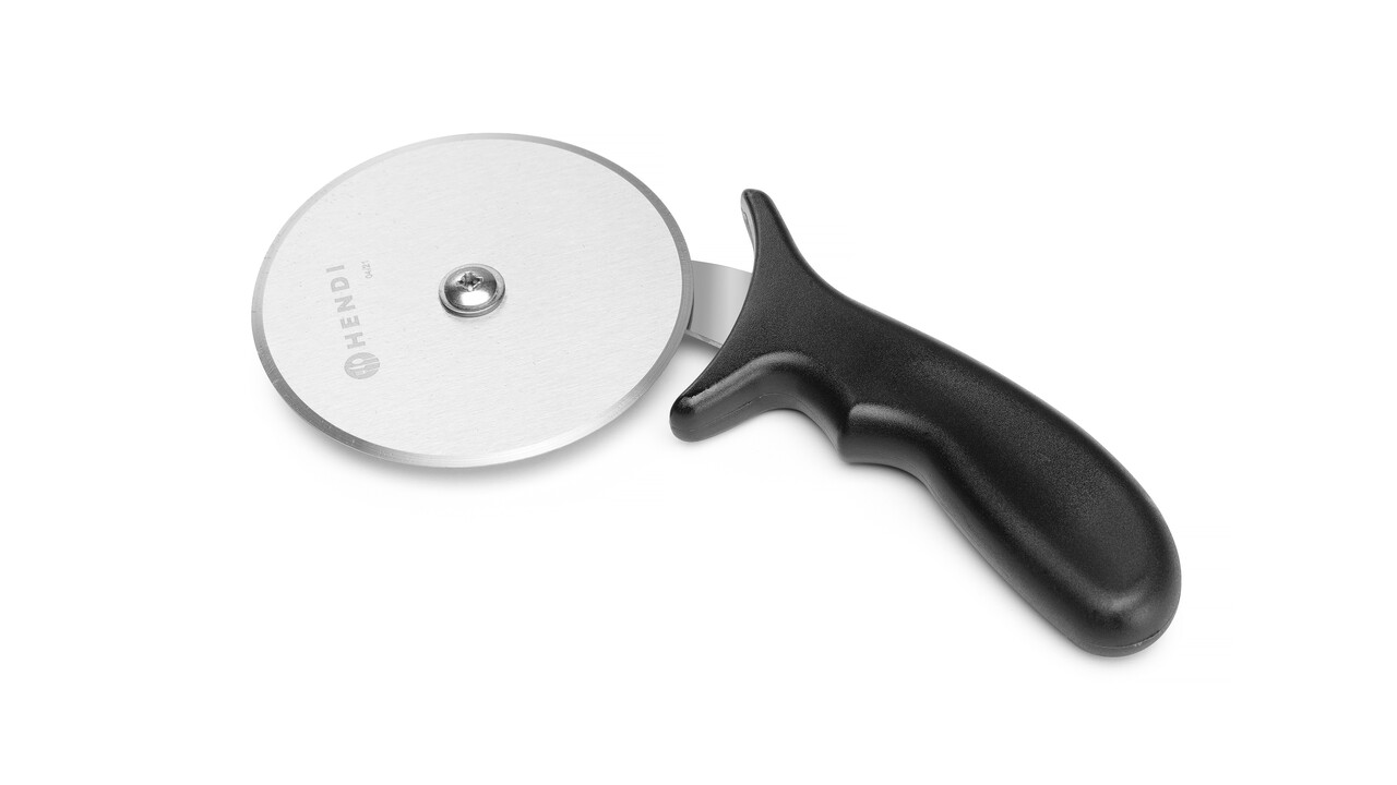 Pizza wielsnijder zwart kunststof handvat. Mes doorsnede 10 cm.