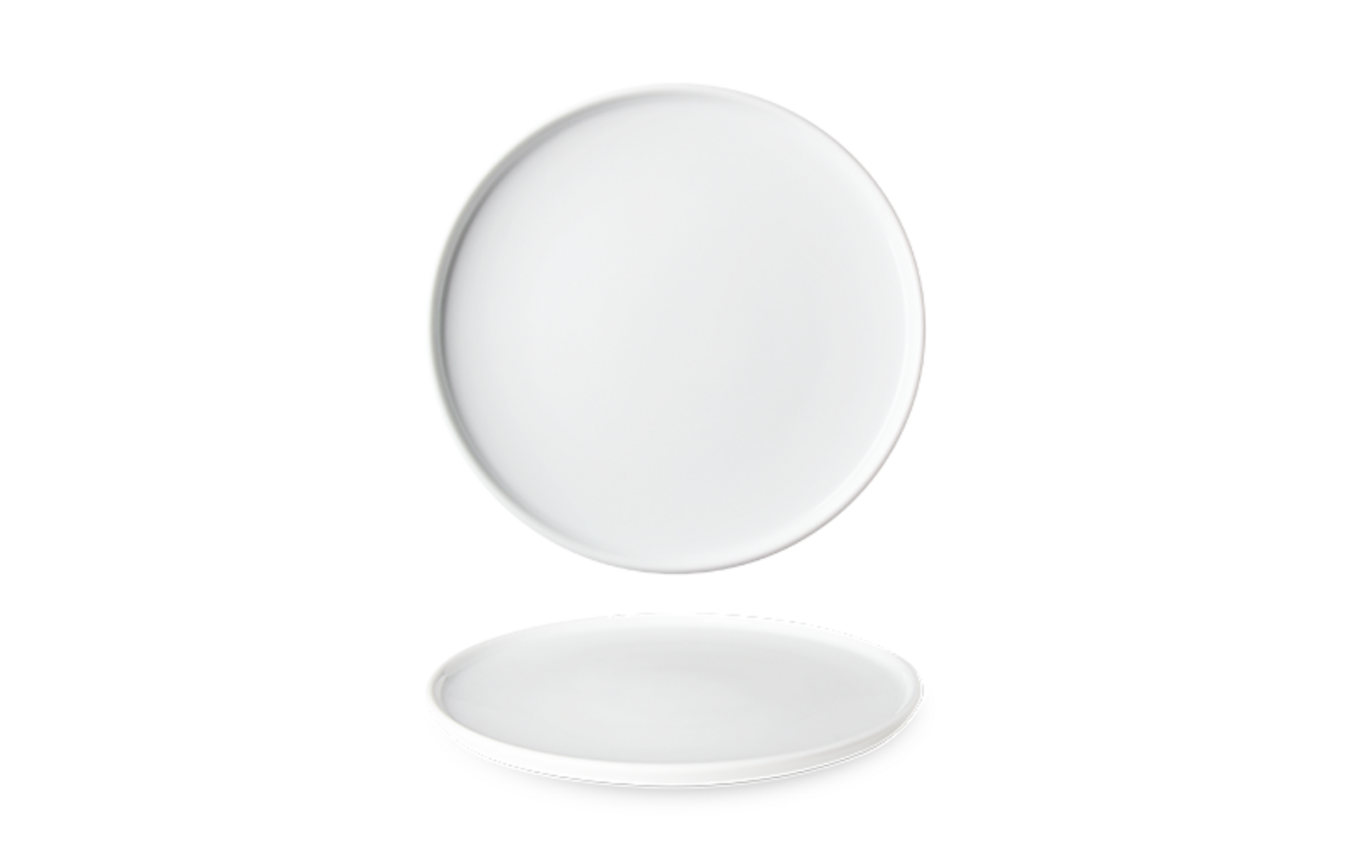 Stapelbaar bord met recht opstaande rand. Hoogte 2,6 cm. Versterkt hotelporselein.