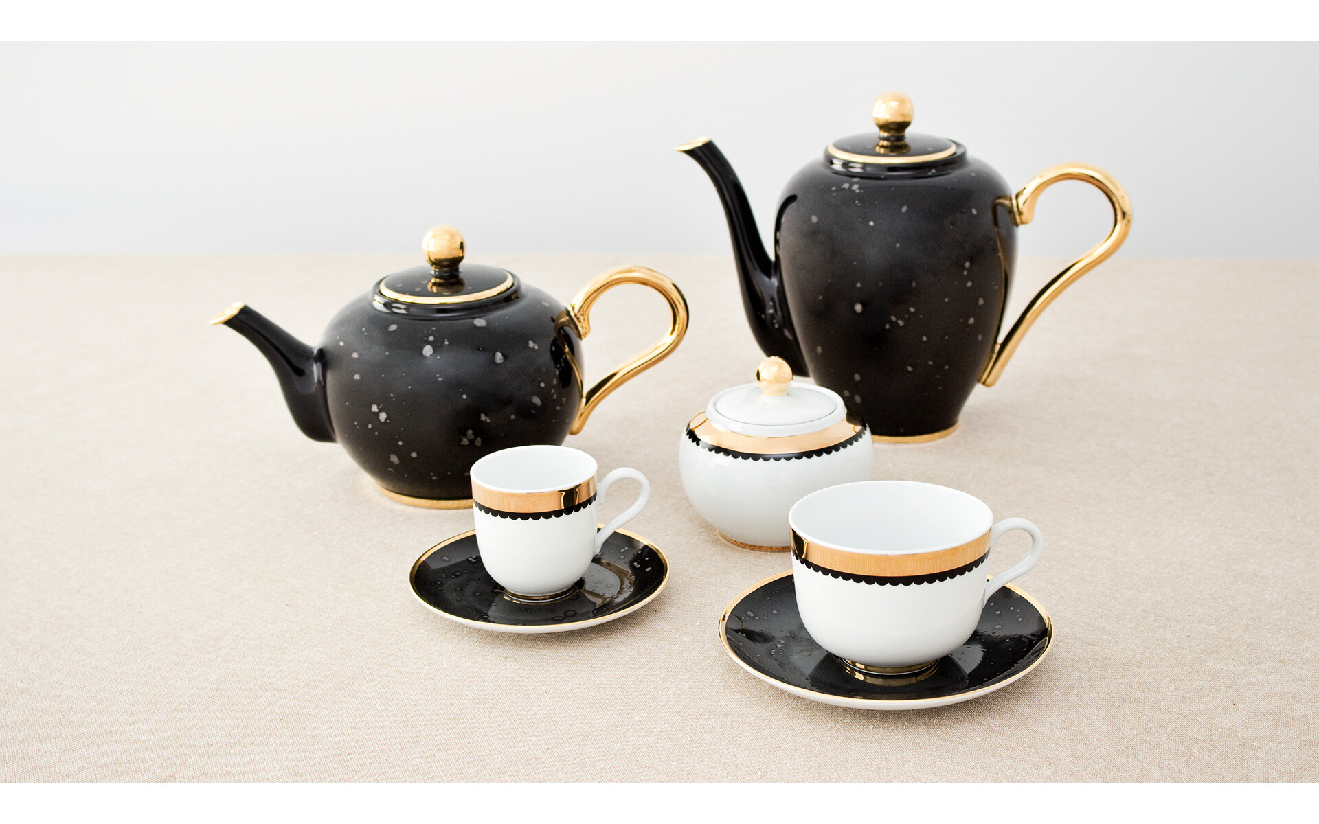 ONTWERP VAN STUDIO PORCEL - SATURN FIJN PORSELEIN, IN TINTEN ZWART EN GOUD. KLEINE VONKEN OP HET OPPERVLAK VAN DE STUKKEN DOEN ONS HERINNERINGEN AAN EEN HEMEL VOL STERREN OP EEN WOLKENLOZE ZOMERNACHT.