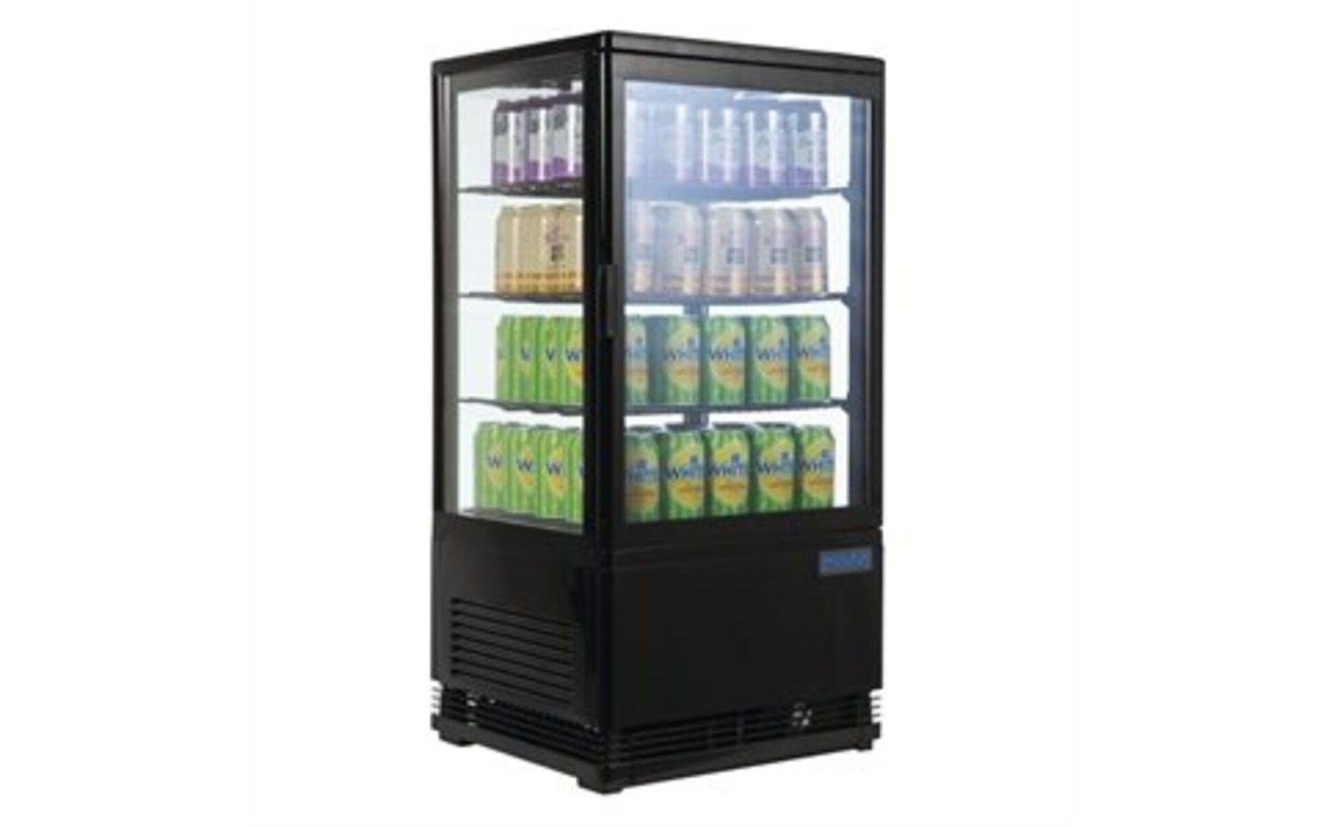 Tafelmodel vitrine aan vier zijden glas, waarvan één met deur. Ideaal voor blikjes, flessen of sandwiches. Voorzien van drie verstelbare schappen en binnenverlichting. Plaats voor 100 standaard blikjes. Automatische ontdooiing. Kleur zwart. Instelbare thermostaat 3C tot 7C. Afmeting: 91(h)x43(b)x39(d) cm.
