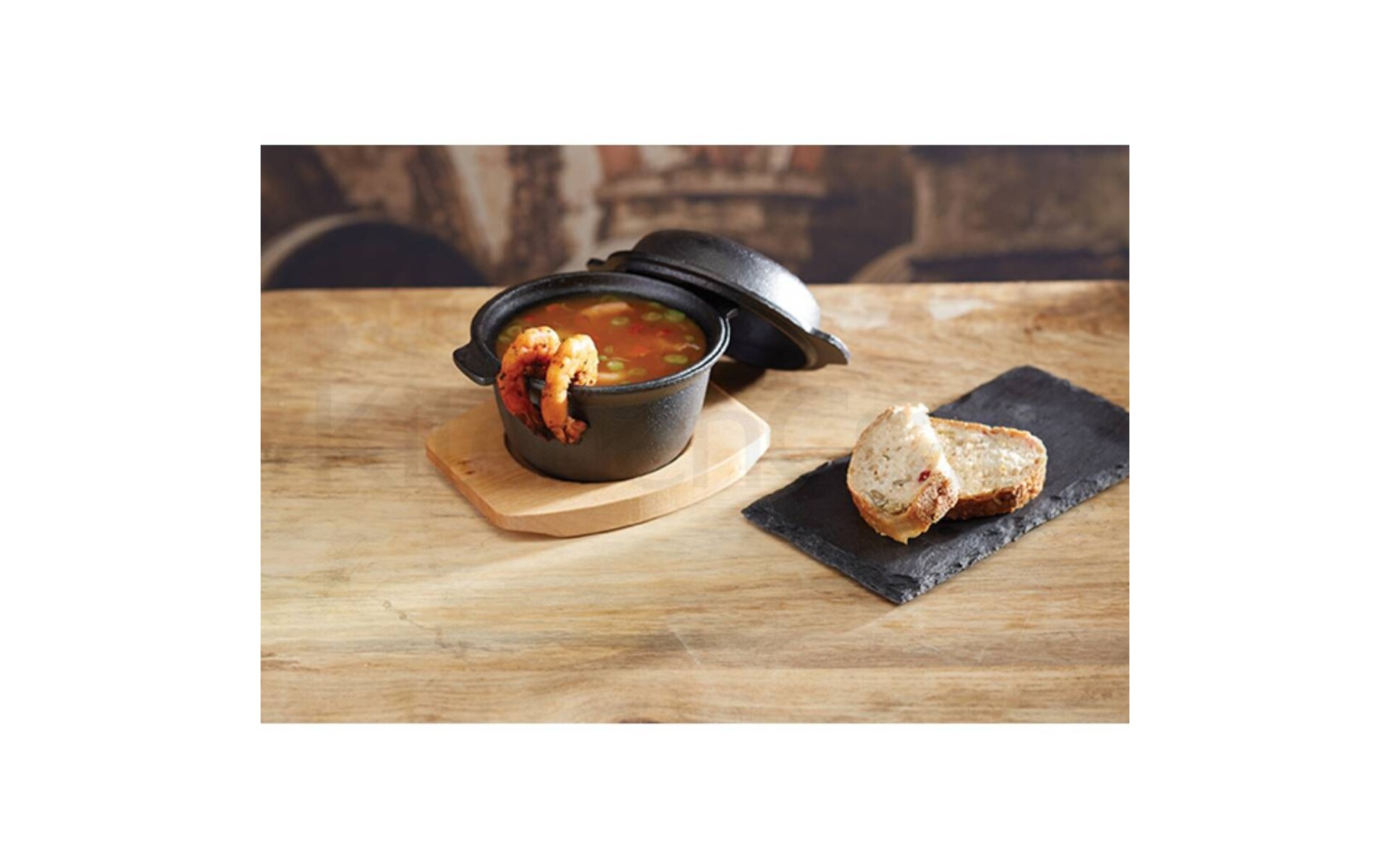 Vóór het eerste gebruik, grondig reinigen met warm zeepwater. Bestrijk het gietijzeren potje met keukenolie. Verwarm uw oven op 200° en plaats het potje in de oven gedurende 15 minuten. Het oppervlak van het gietijzer zal zo smaak afgeven en een antiaanbaklaag wordt gevormd. Het gietijzer zal zeer heet worden. Gebruik een ovenhandschoen om het potje uit de oven te verwijderen. Plaats het potje op het houten plankje en breng de gegrilde of gebakken ingrediënten erin. Het gietijzer behoudt de warmte en houdt het gerecht warm op tafel. Steek het plankje niet in de oven. Reinig door te wassen met een vochtige doek. Steek het potje en het plankje niet in de vaatwas.