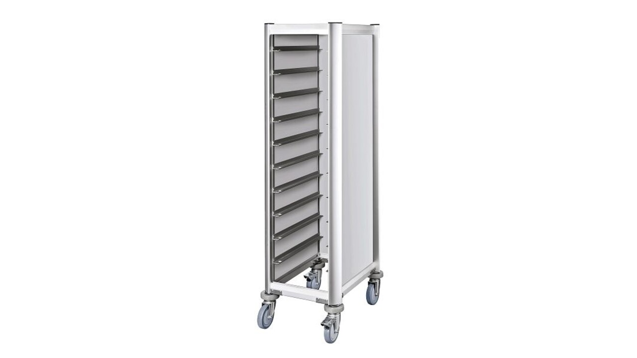 Regaalwagen voor 10 dienbladen 45,5 x 35,5 cm aluminium frame met MDF zijpanelen