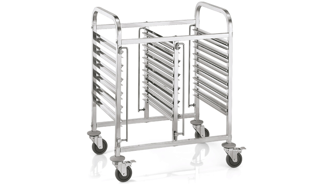 Met veiligheidsbeugel om te voorkomen dat containers of trays eruit glijden.