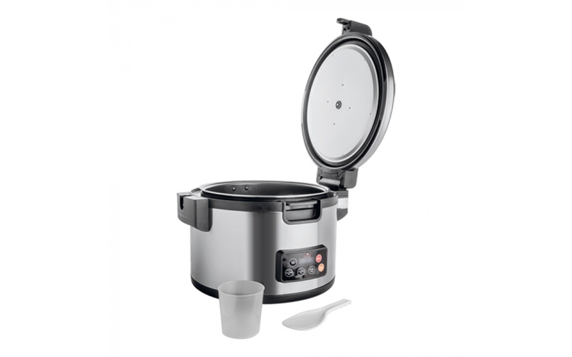 Elektrische rijstkoker roestvrijstaal , dubbelwandig, inwendig voorzien van een anti-aanbaklaag, kookt rijst en houdt deze automatisch op temperatuur