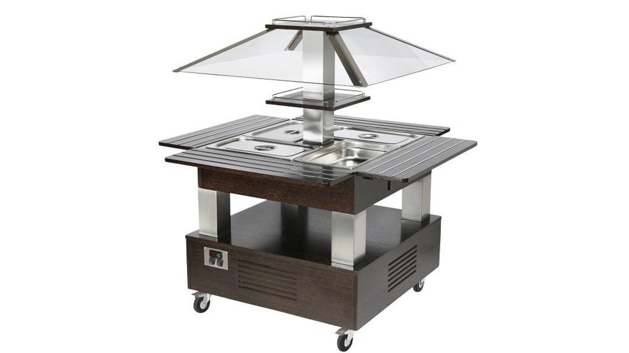 Koud buffet (+2/+10°C), gekoelde inox kuip voor 4 x GN 1/1-150 door contactkoeling. Koelgas R 134a , geen CFK’s, compressor U.H./ Danfoss. Capaciteit 4x GN 1/1-150 mm.