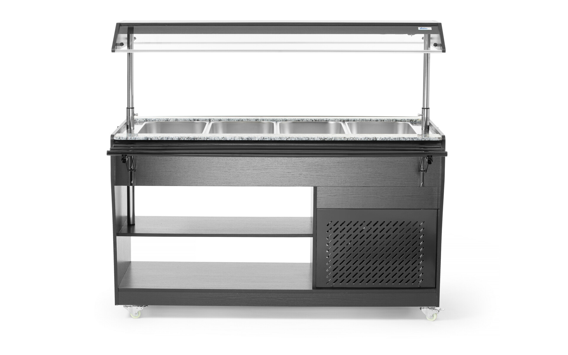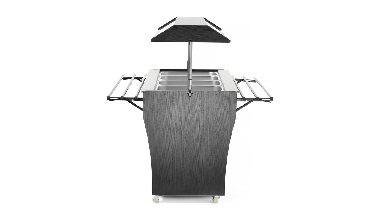 Dit verwarmde buffet heeft ruimte voor 4 GN 1/1, die bij de set zijn inbegrepen. Het buffet is uitgerust met verlichting in de luifel, heeft 2 planken eronder voor het opbergen van borden en bestek en is gemakkelijk te verplaatsen dankzij 4 zwenkwielen