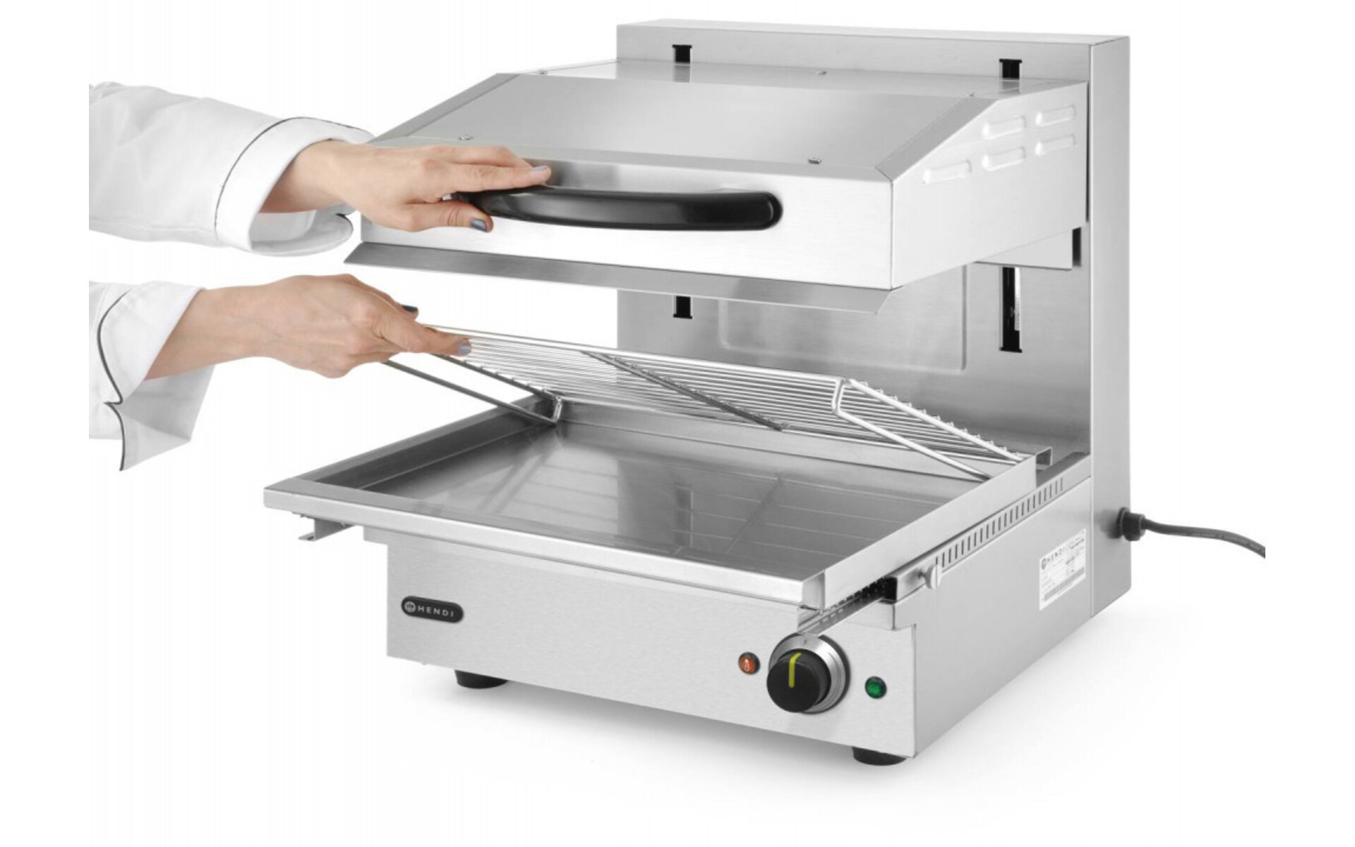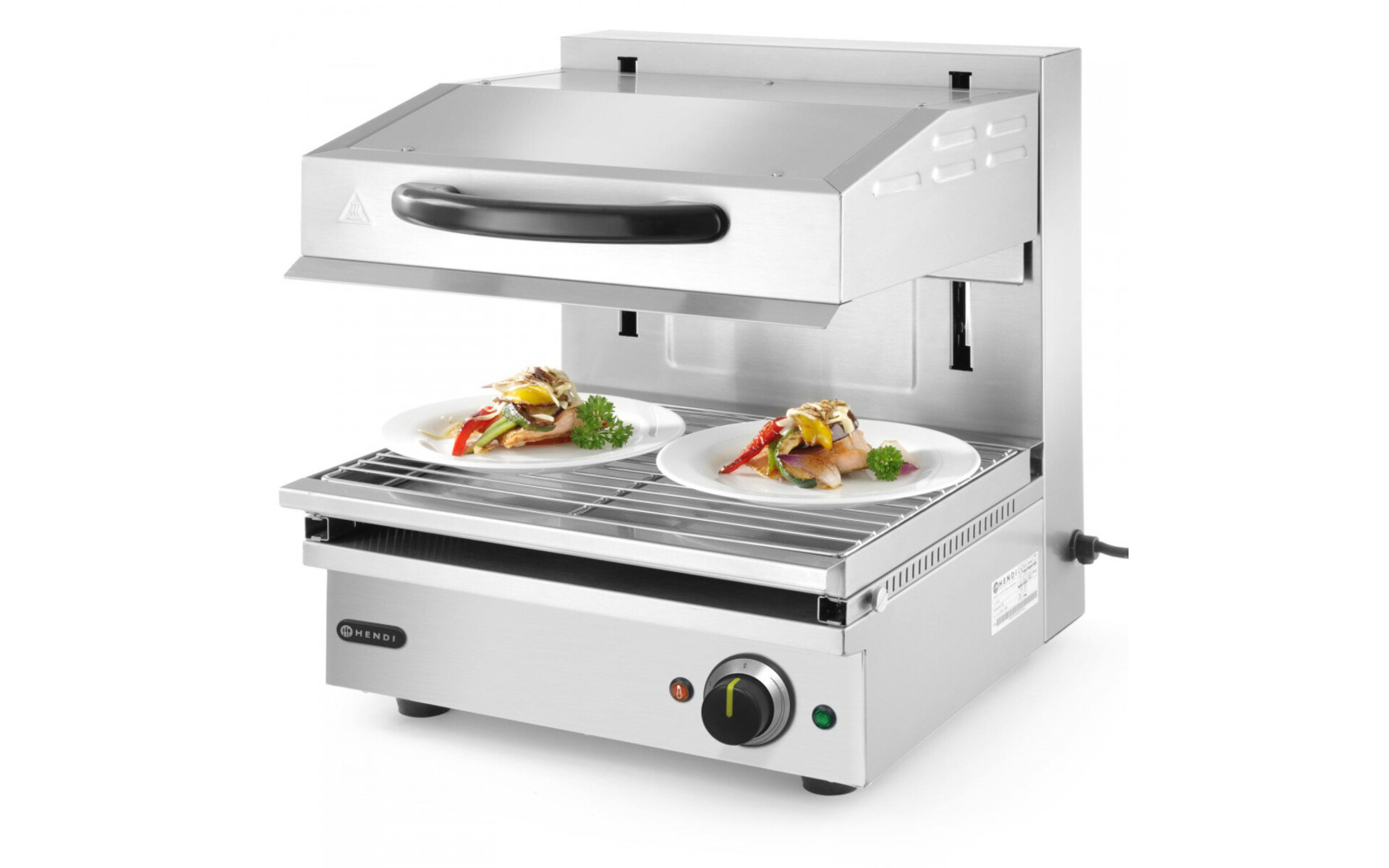 Thermostaat traploos instelbaar tot maximaal 300°C, met controlelampjes.