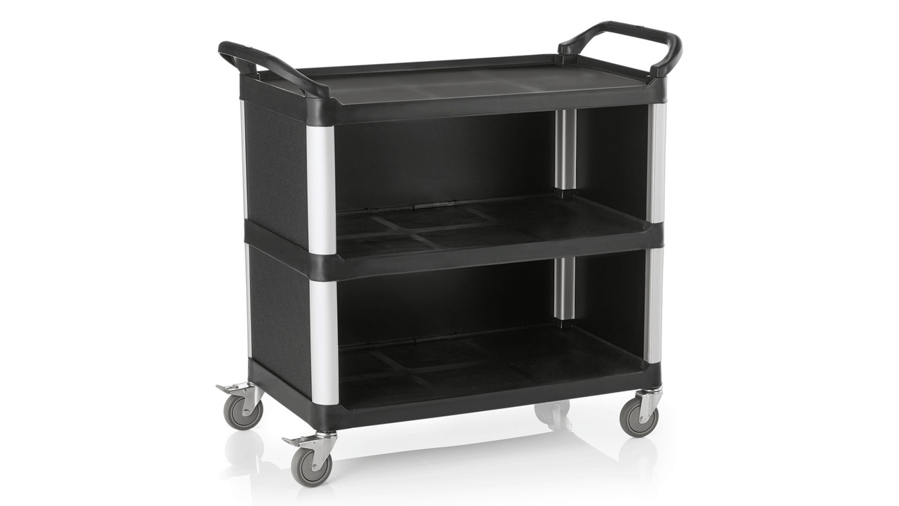 Serveerwagen van polypropyleen in een aluminium frame, gesloten uitvoering met zij- en achterwand, afmetingen 103 x 50,5 x 95,5 cm, frame met 4 zwenkwielen, zij- en achterwand gesloten, draagvermogen ca. 25 kg per legbord, eenvoudige montage.