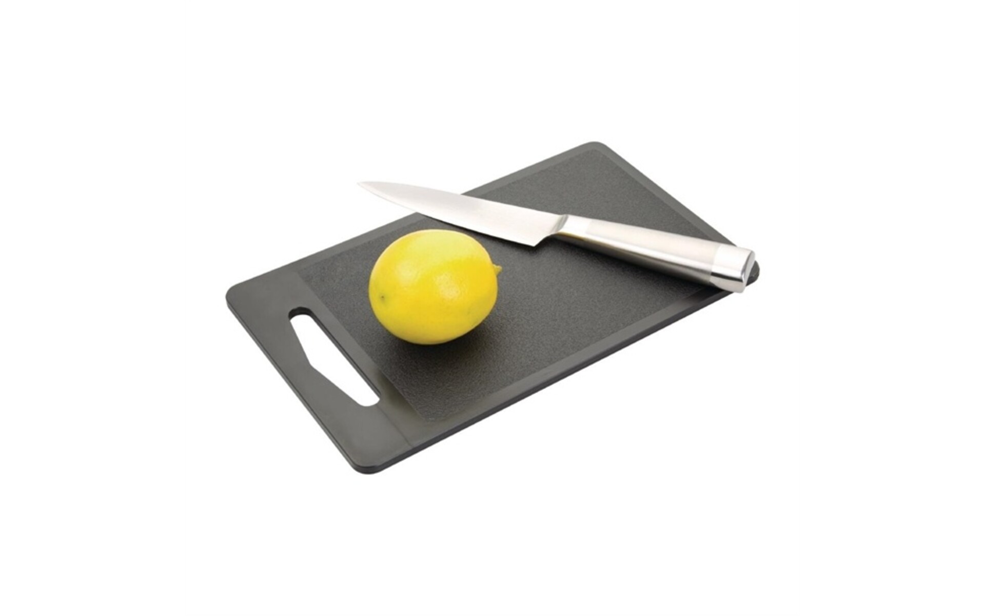 Perfect voor bars en keukens. Deze zwarte snijplank is ideaal voor het snijden van fruit en garneringen. Met handige handgreep en getextureerd oppervlak om afglijden van voedsel te voorkomen. Makkelijk te reinigen. Geleverd ZONDER mes