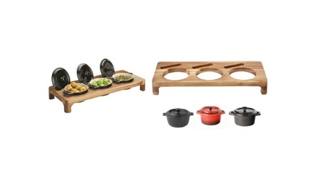 Stand hout inclusief 3 gietijzeren mini cocottes Ø 10 cm inhoud 35 cl