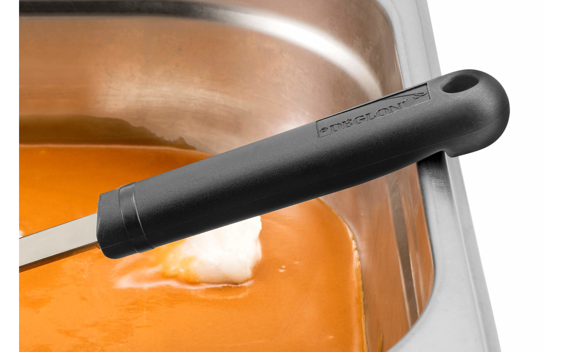 Het bijzondere van deze serie (die het onderwerp is geweest van een industriële eigendomsregistratie) is de inkeping onder de handgreep die voorkomt dat het gereedschap wegglijdt wanneer het in de serveerschaal wordt geplaatst.