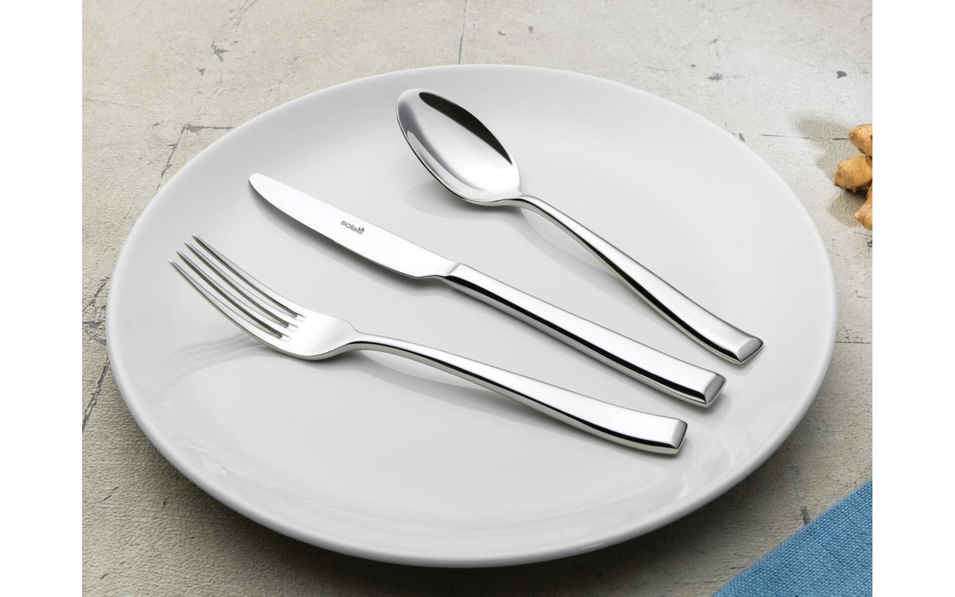 Denk aan de prachtige kuststad in het oosten van Zuid-Afrika, waar de koude en warme golfstroom elkaar ontmoeten. Dit contrast is op subtiele wijze teruggebracht in een lijn die enerzijds stoer is door de hoeken in het design, anderzijds elegant door de ronde afwerking. Een zwaar model om uw gasten met te verwelkomen en zeer aangenaam om mee te eten.