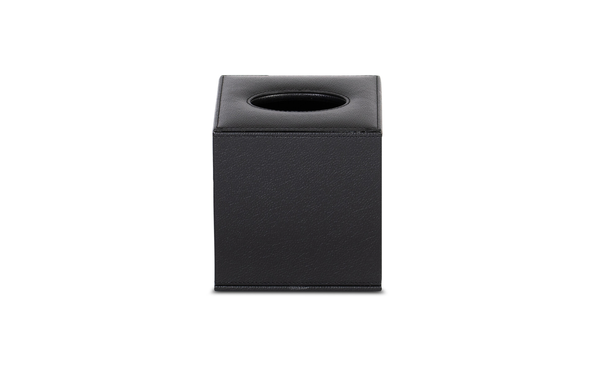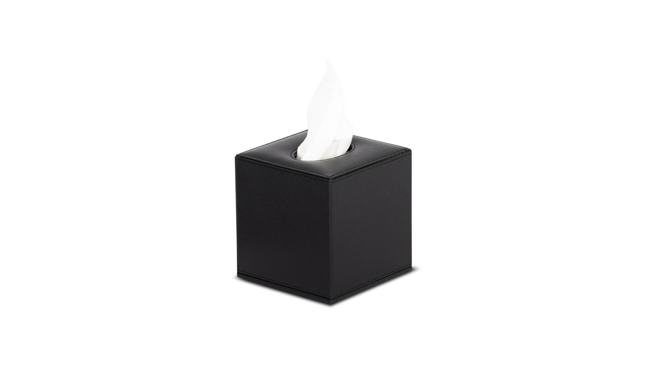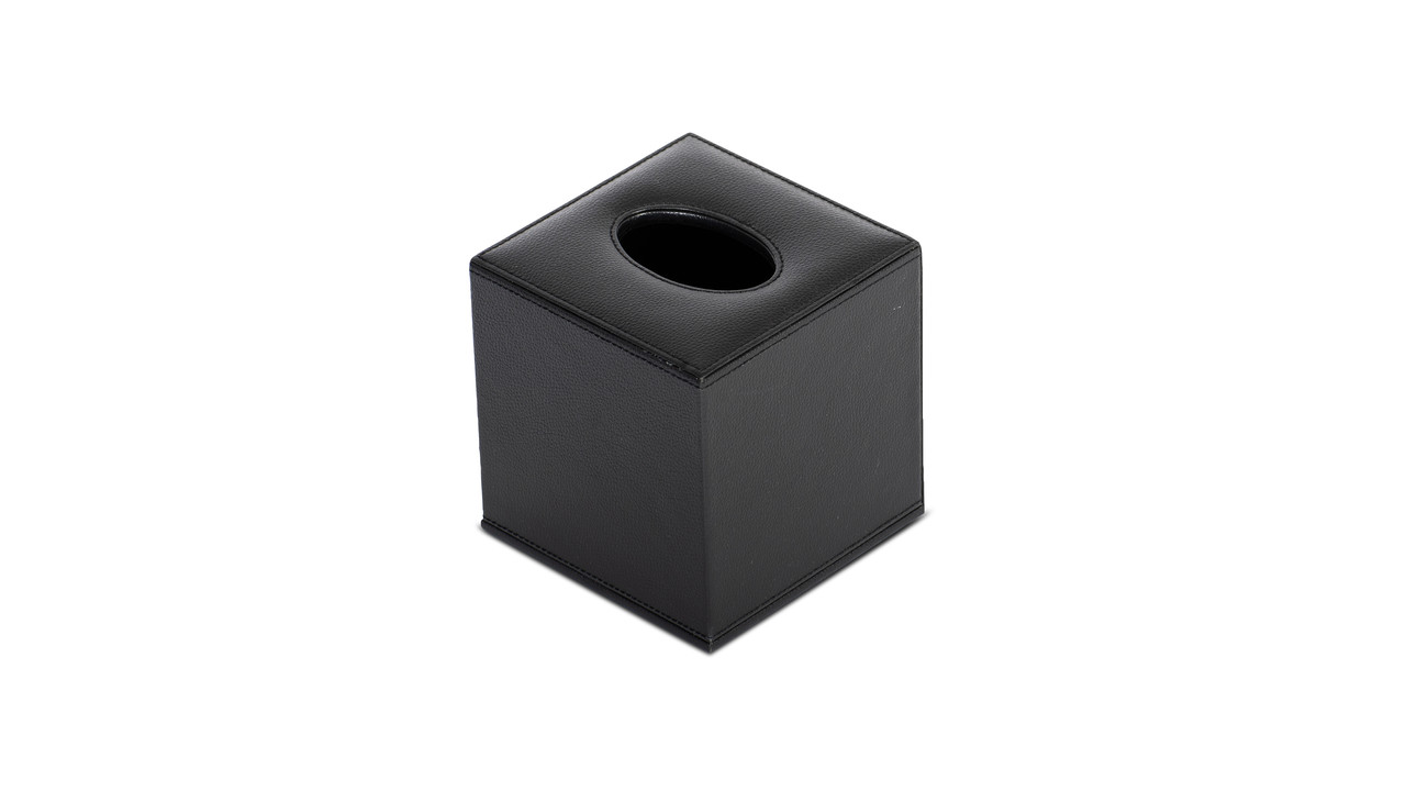 Echt lederlook met zwarte stiksels. Waterafstotend. Makkelijk schoon te maken. Geschikt voor de meeste cleenex cube dozen. Voorzien van magnetische sluiting. Afm. 13,5 x 13,5 x h 14 cm .