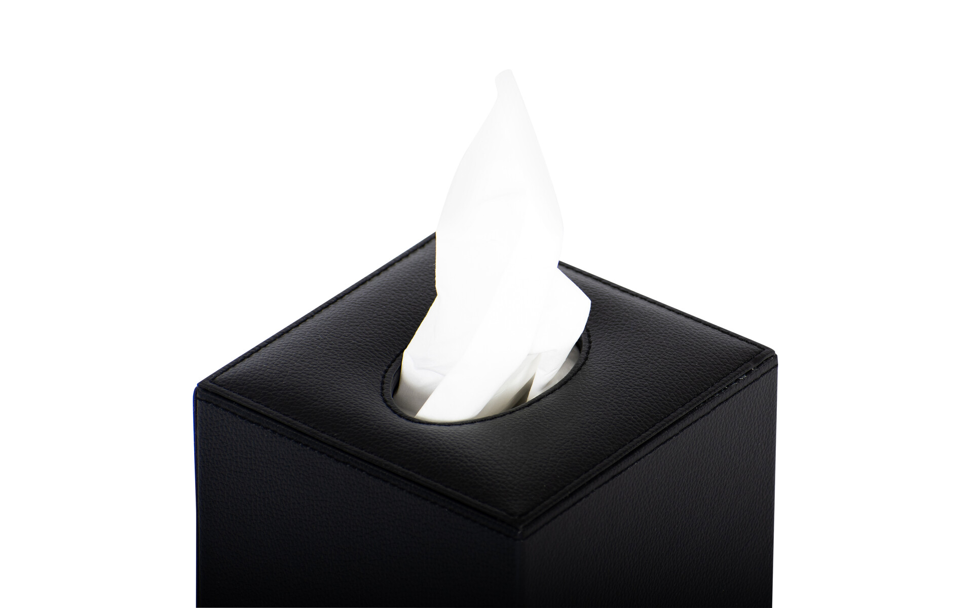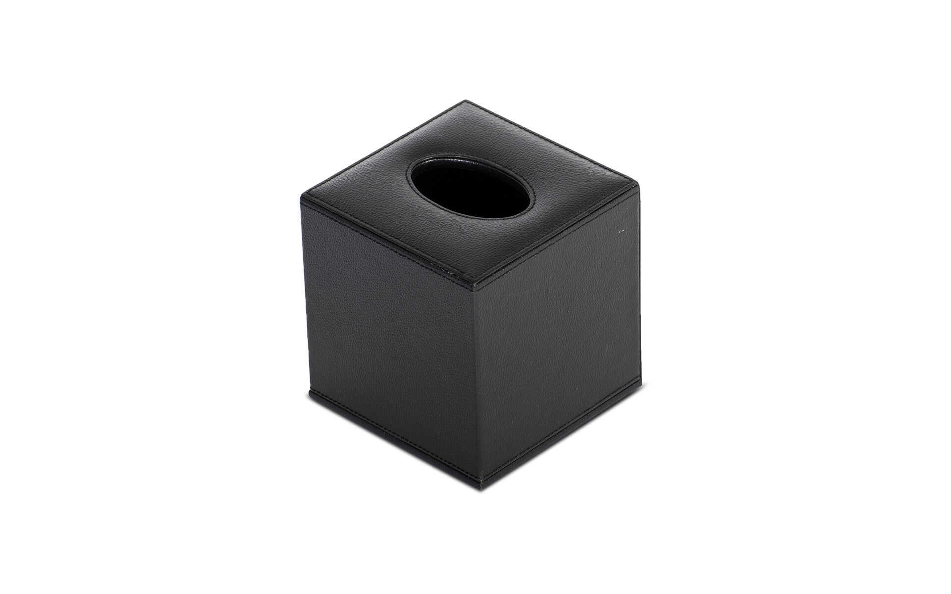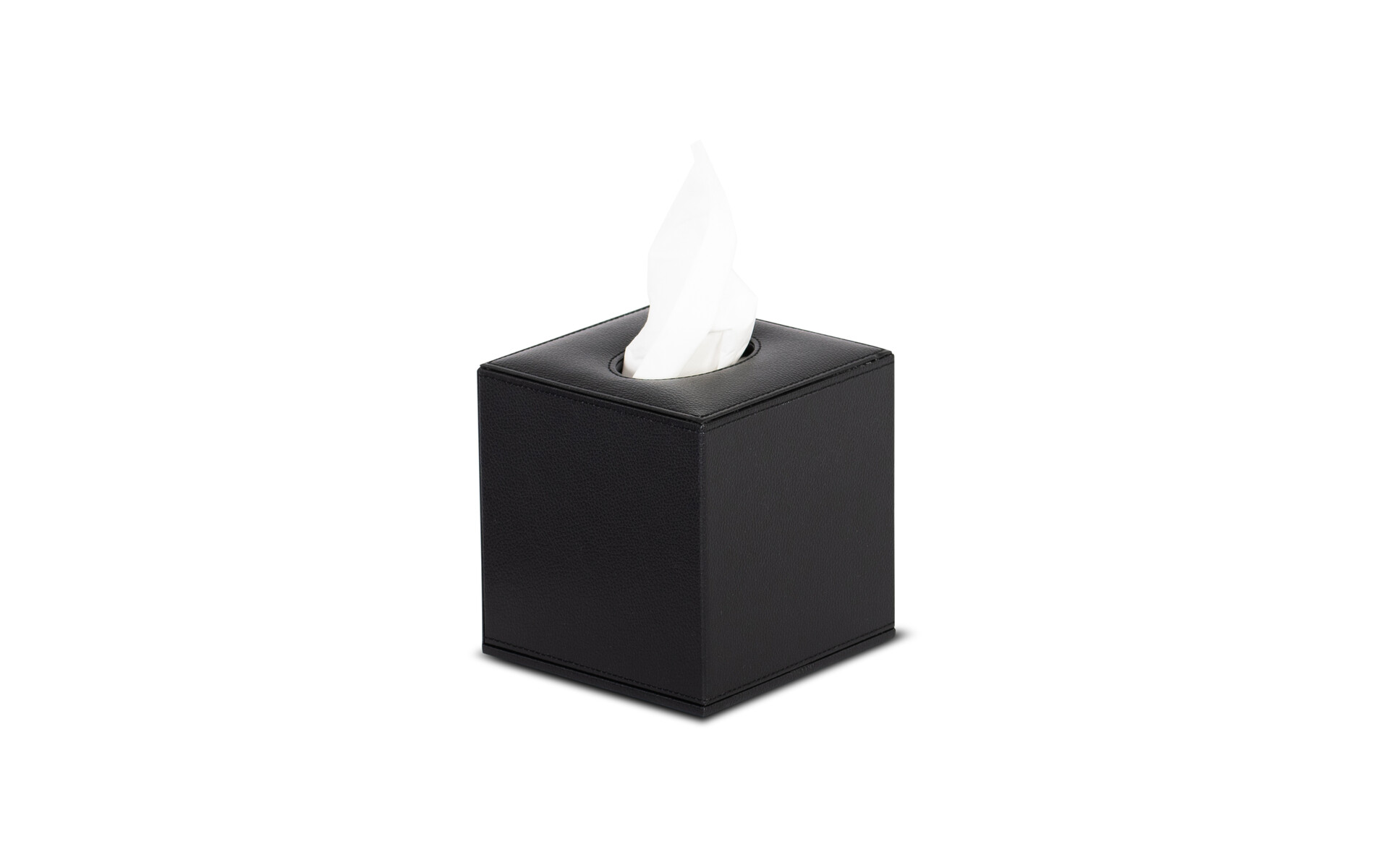 Echt lederlook met zwarte stiksels. Waterafstotend. Makkelijk schoon te maken. Geschikt voor de meeste cleenex cube dozen. Voorzien van magnetische sluiting. Afm. 13,5 x 13,5 x h 14 cm .