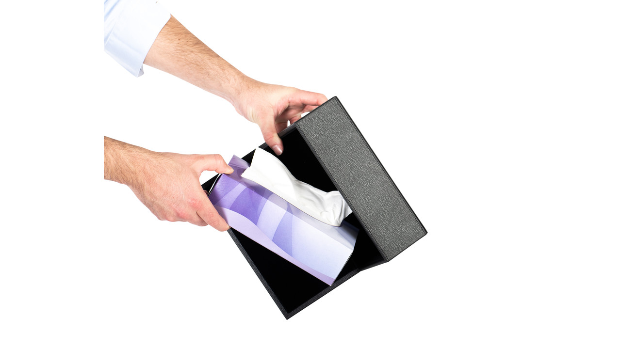 Echt lederlook met zwarte stiksels. Waterafstotend. Makkelijk schoon te maken. Geschikt voor de meeste cleenex cube dozen. Voorzien van magnetische sluiting. Binnenzijde velours. Afm. 25 x 13,5 x h 8,5 cm