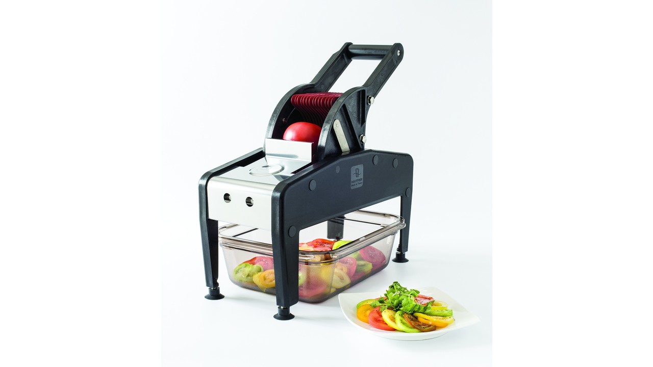 De handmatige tomatensnijder snijdt zelfs zeer rijpe tomaten, in plakjes van 6 mm, ideaal voor salades, hamburgers, sandwiches ...