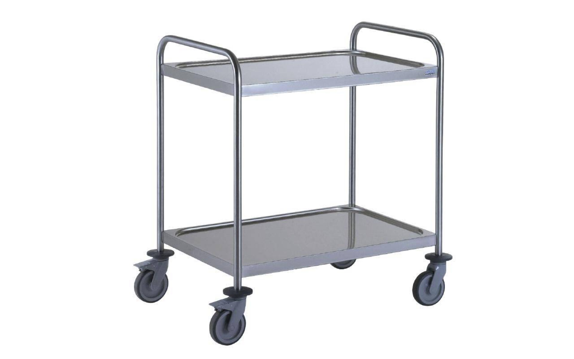 2 bladen, 80x53cm. Materiaal: RVS • Geheel gelaste RVS constructie • Geluidsarme bladen • 4 zwenkwielen, waarvan 2 geremd • Belastbaar tot 50kg per blad