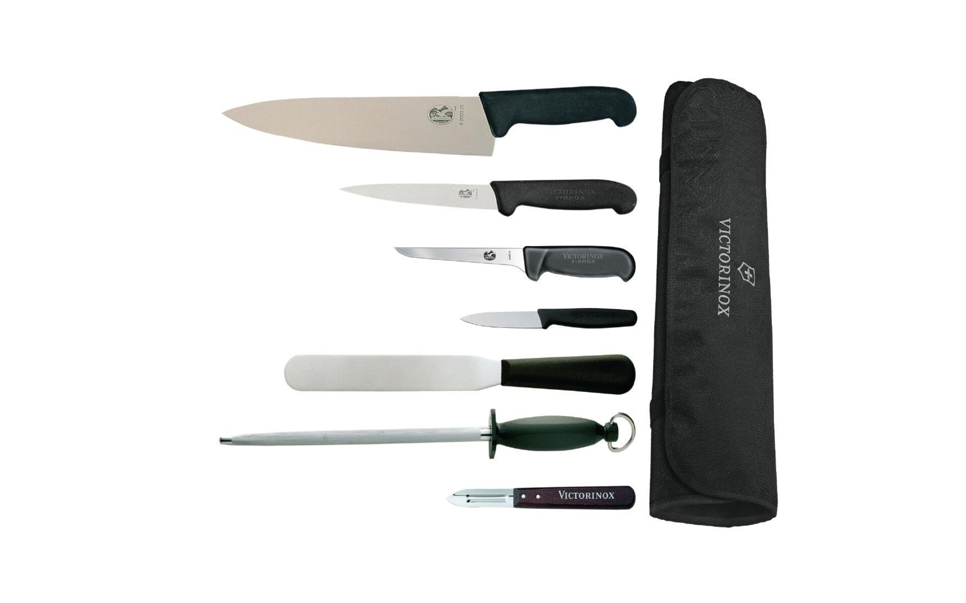 25 cm koksmes; 15 cm fileermes; 12,5 cm uitbeenmes; 20 cm paletmes; 25 cm slijpstaaf; 7,5 cm ( Vogue géén Victorinox ) officemesje; dunschiller;