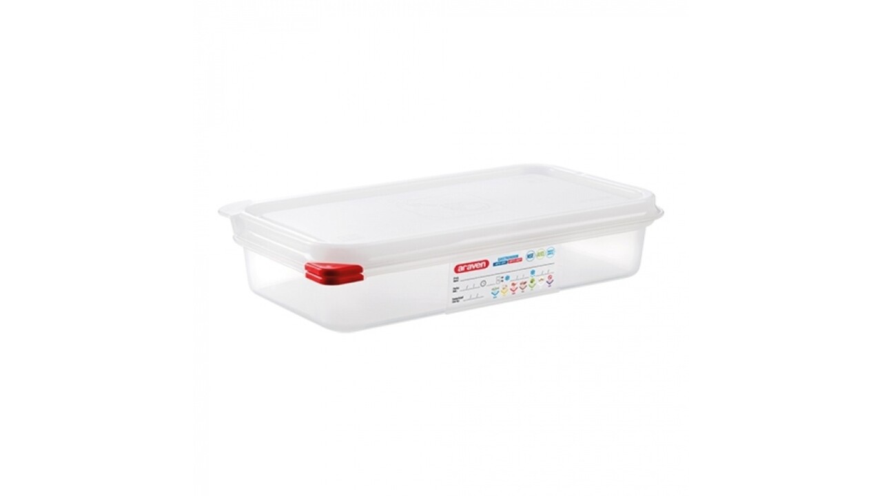 Araven kleurcode GN voedseldozen Tot en met GN 2/3 luchtdicht afsluitbaar door uniek dubbel sluitsysteem Geschikt voor gebruik tussen de -40 en + 90 graden Wordt compleet geleverd met COLORCLIP coderingsset volgens de HACCP normen
