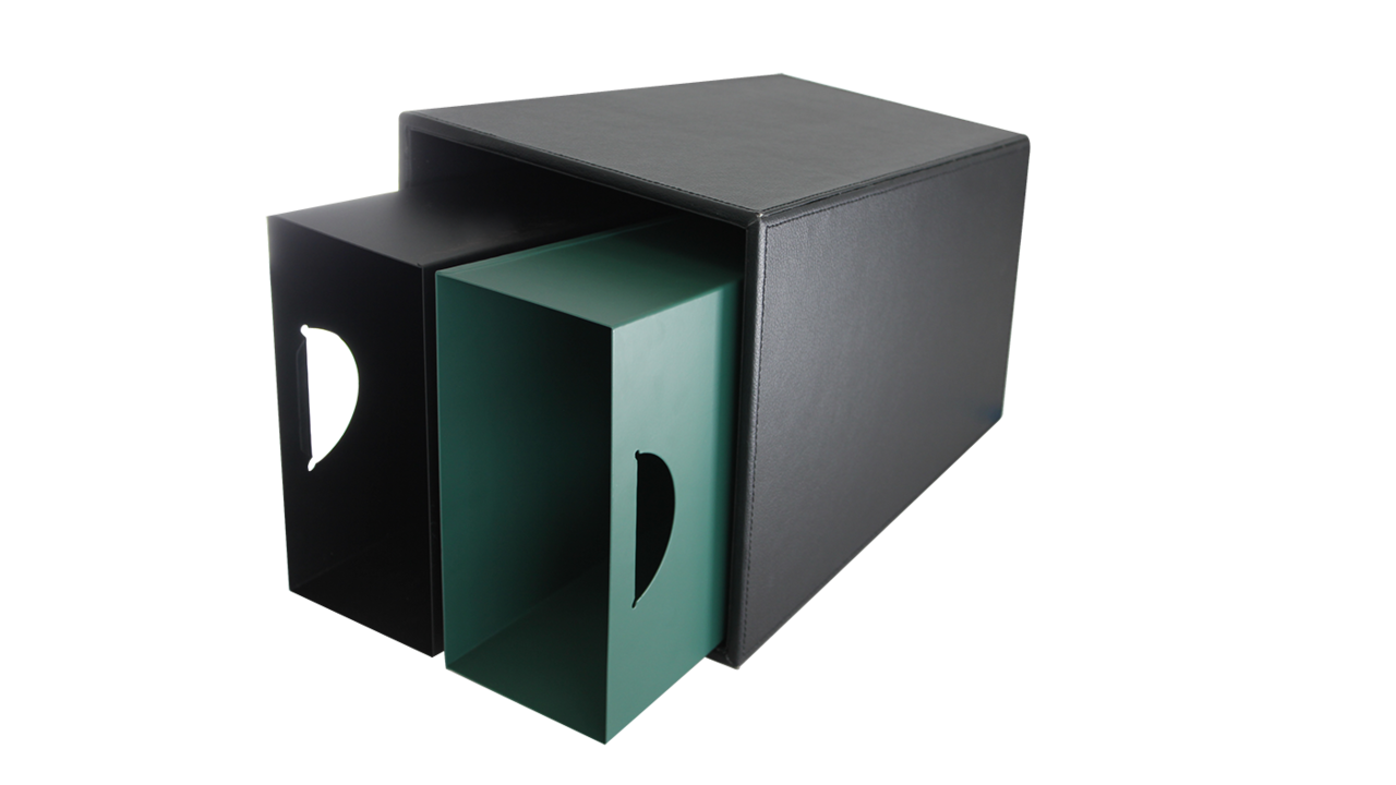 Dit luxe duo kamervuilbakje is voorzien van één zwarte en één groene inzet om het mogelijk te maken om vuilnis te sorteren. Het zwarte PU-leer aan de buitenkant is brandwerend. Afmetingen : 180/230 cm h 300 mm