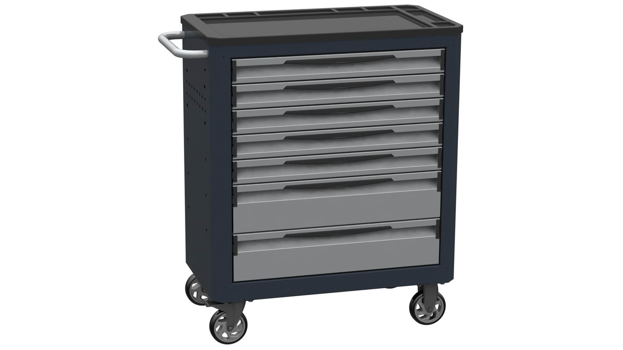 Stalen trolley bestaande uit 7 laden gemonteerd op kogelgeleiders inclusief: