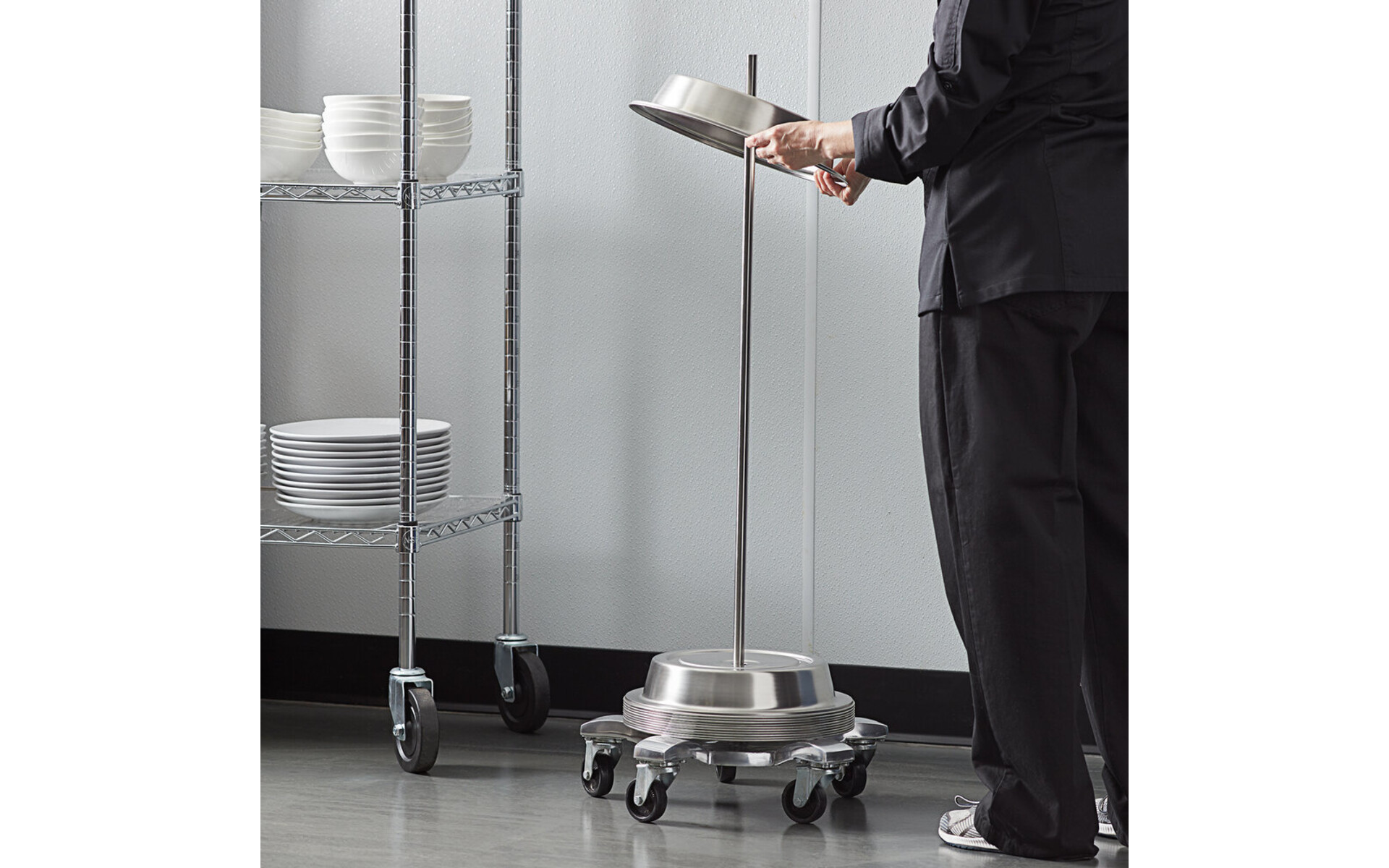 Uw borden klokken in bulk vervoeren was nog nooit zo eenvoudig met deze trolley gemaakt van aluminium. Deze wagen biedt plaats aan maximaal 175 bordenhoezen en zorgt voor een snelle service! De basis heeft een diameter van 50 cm en is gemaakt van stevig aluminium om ervoor te zorgen dat u uw borden covers veilig en efficiënt kunt verplaatsen. Een stalen inschroefbare staaf draagt bij aan de duurzaamheid van deze wagen en zorgt ervoor dat uw plate covers goed blijven zitten.