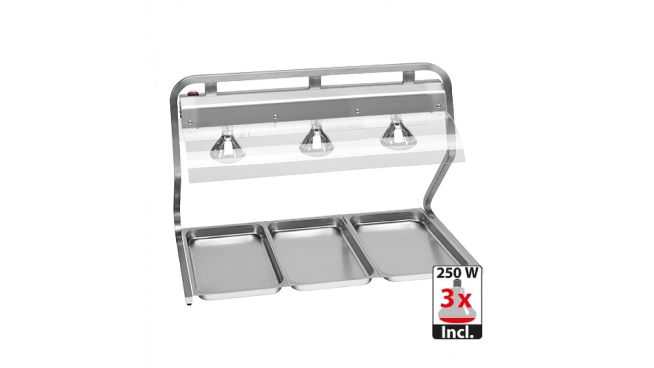 Deze gebruiksvriendelijke warmtelamp houdt gerechten en snacks op de ideale serveertemperatuur tot het moment van uitserveren. Voorzien van drie infraroodlampen en een hygiënische acryl beschermkap, ideaal voor buffetgebruik en geleverd zonder GN-schotels