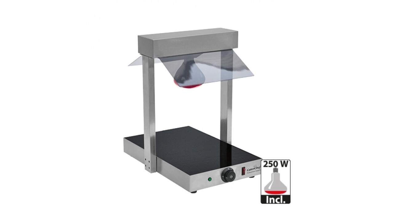 Eenvoudig in ontwerp en gebruik, houd uw gerechten en snacks op de juiste temperatuur totdat u ze serveert. Dit model heeft een afzonderlijk schakelbare keramische verwarmingsplaat en een infraroodlamp, de verwarmingsplaat is thermostatisch regelbaar tot 85°C. Compleet met hygiënische beschermhoes van acrylglas en daardoor zeer geschikt voor buffetten, ontbijtbuffetten, cateringevenementen en keukengebruik.
