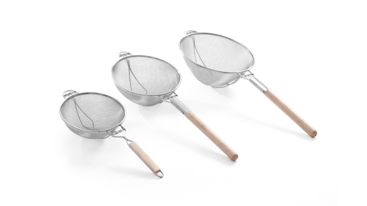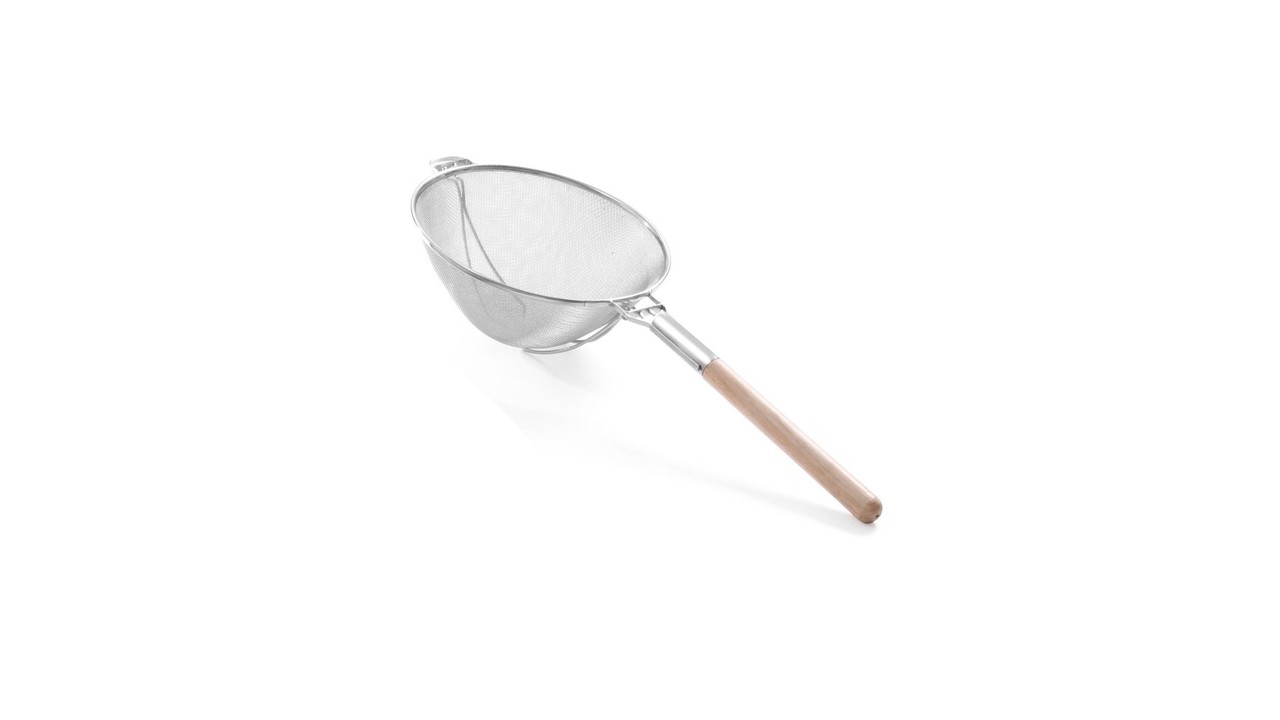 Zeef met dubbelgaas vertind met houten handgreep diameter 31 cm