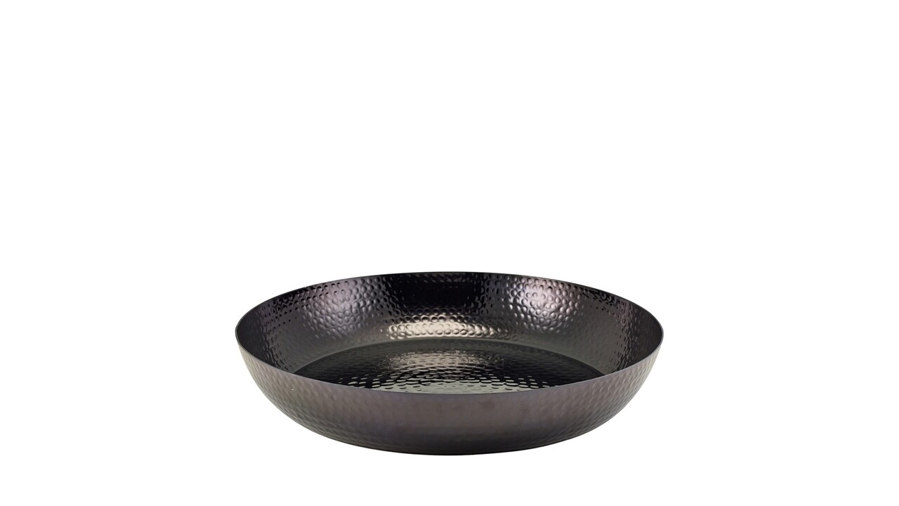 Zeevruchtenschalen afmetingen Ø 31 x h7 cm en Ø 44 x h 7,2 cm. Aluminium schaal - zwart - Aantrekkelijke gegalvaniseerde foodsafe coating. Geleverd met koperen standaard hoogte: 18 cm. Gemaakt van gecoat staal voorzien van een antislip kunststof coatin