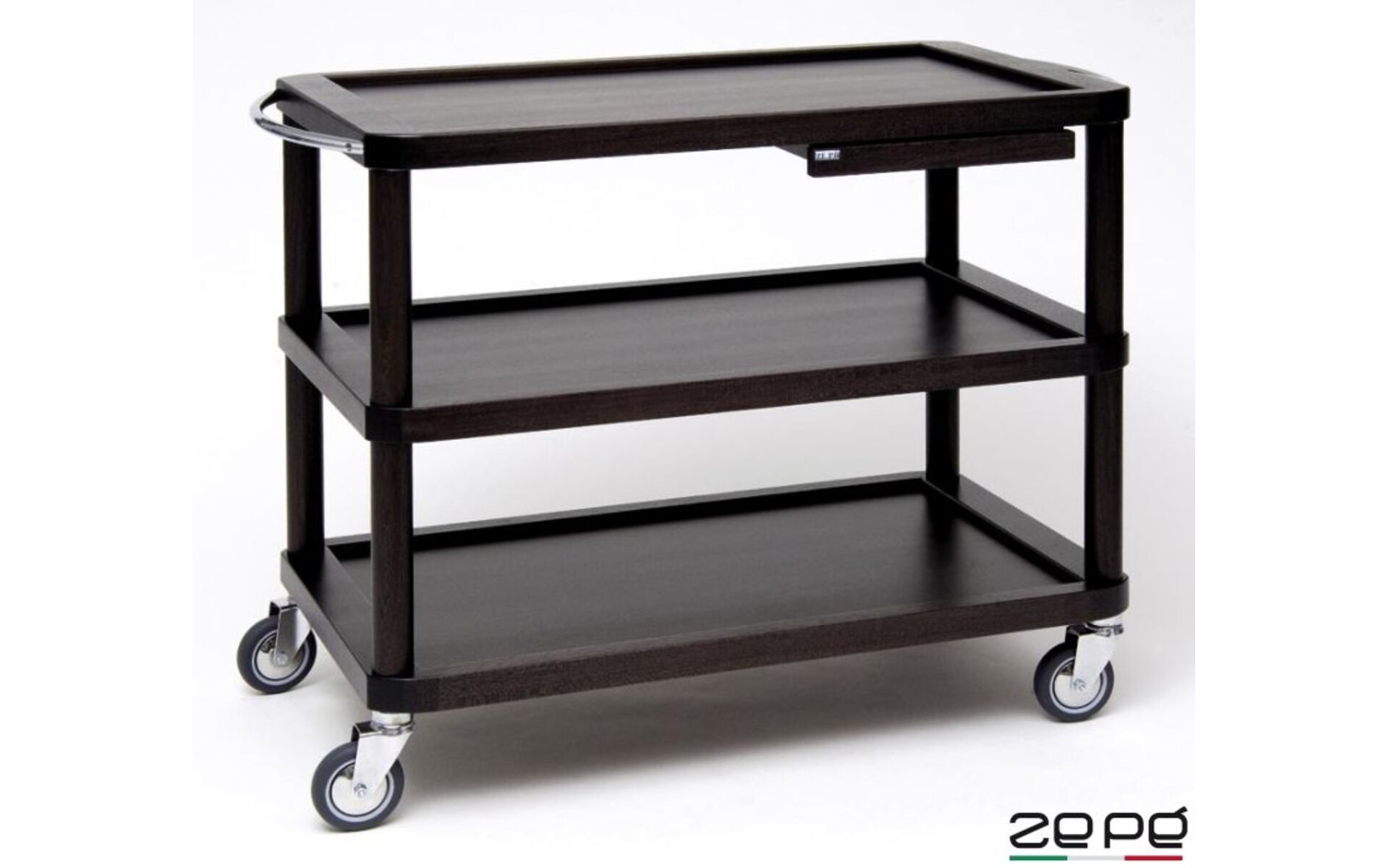 Model ROMA base Wengé kleur. Afm. 106 x 52 x H 80 cm. Met 3 legbladen Gewicht 35 kg. 4 wielen diameter 100 mm. Rem verkrijgbaar tegen meerprijs. Hoogwaardig hout verkrijgbaar in tanganica, walnut, mahogany, rosewood en wengé uitvoering